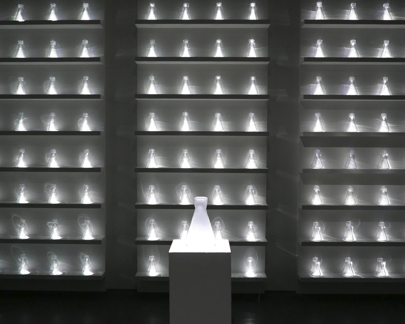 Ainsi, à la manière d’un automate que l’on aurait rechargé, la machine se met en marche, nous immergeant dans un espace sonore uniquement créé par les vibrations des autres tirelires en verre.