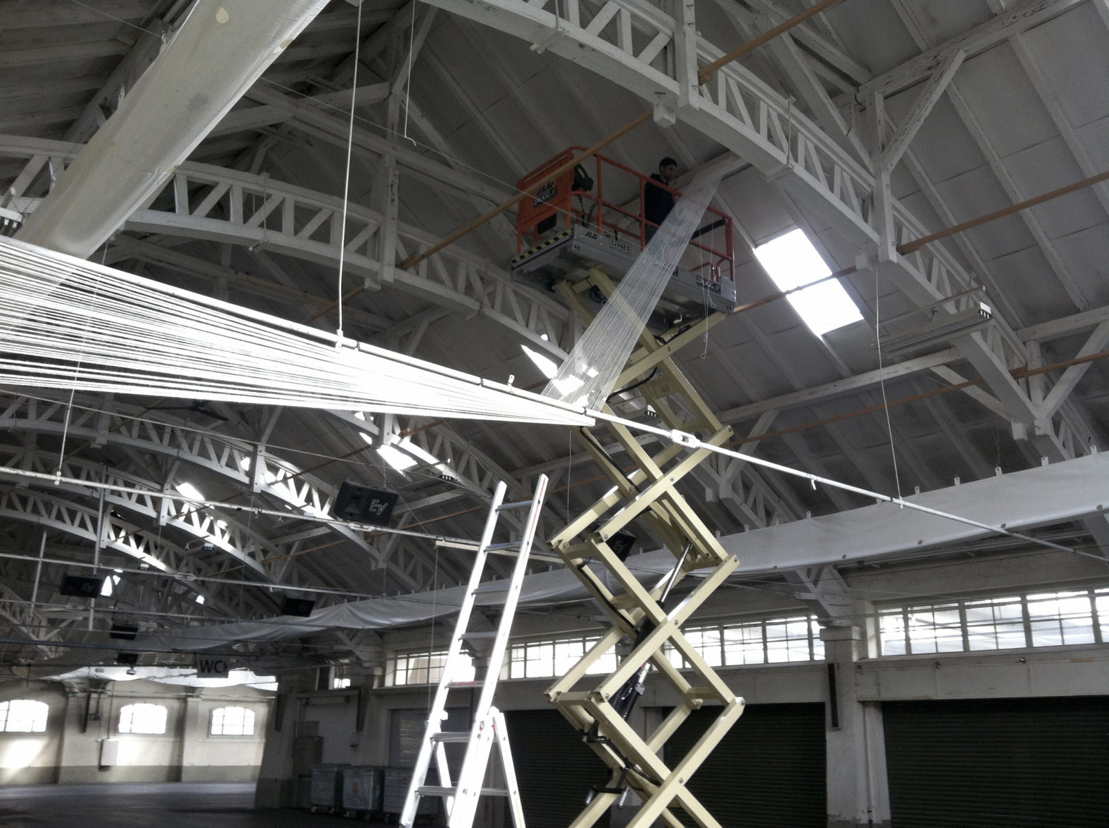 L’inspiration principale vient des fascinantes machines utilisées dans les usines de Lantal pour assembler tous leurs fils en une seule pièce de tissu. Twist’ a pour but de mettre en lumière ce processus de fabrication caché, avec des centaines de cordes à travers une pièce avec projection vidéo leur donnant du mouvement.